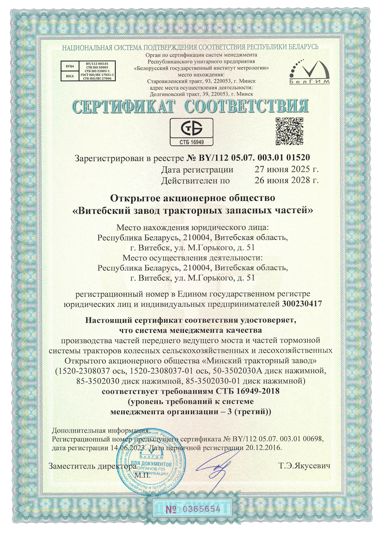 Система менеджмента качества производства частей переднего ведущего моста и частей тормозной системы тракторов колесных сельскохозяйственных и лесохозяйственных Открытого акционерного общества "Минский тракторный завод" соответствует требованиям СТБ 16949-2018 (уровень требований к системе менеджмента организации-3 (третий)).