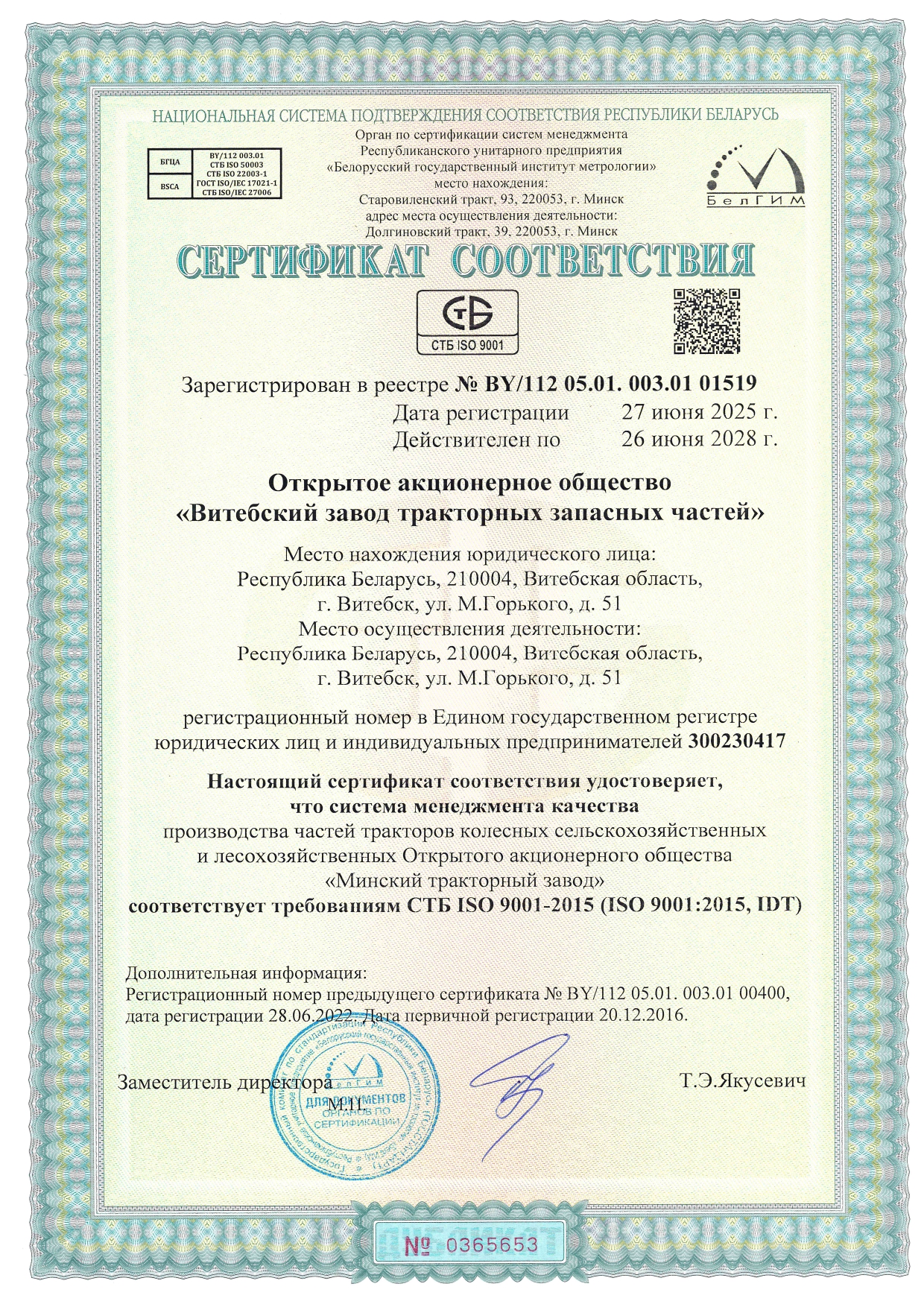 Система менеджмента качества производства частей тракторов колесных сельскохозяйственных и лесохозяйственных Открытого акционерного общества "Минский тракторный завод соответствует требованиям СТБ ISO 9001-2015 (ISO8001:2015, IDT).